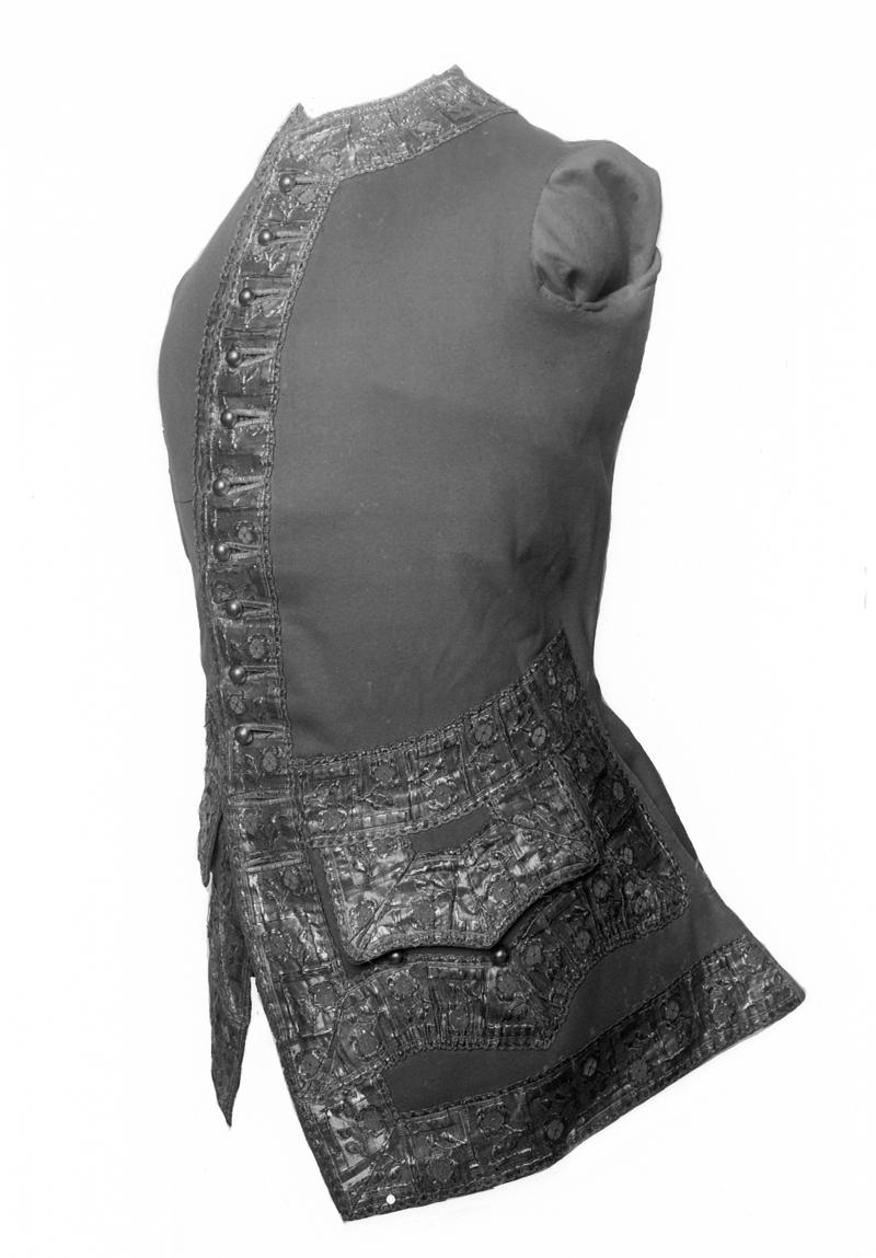 man's lounge suit; black pin-striped trousers with turn-ups; single breasted jacket fastened by 1 button; single breasted black waistcoat with 4 pockets & 5 button closure.