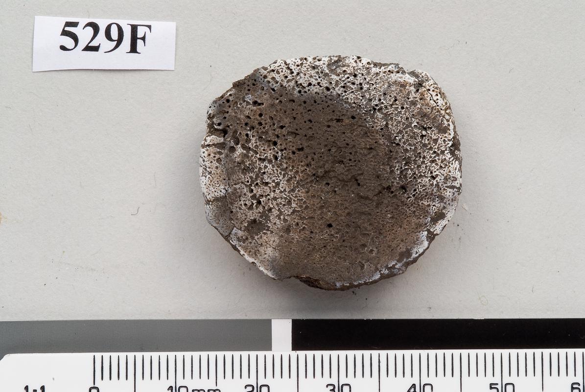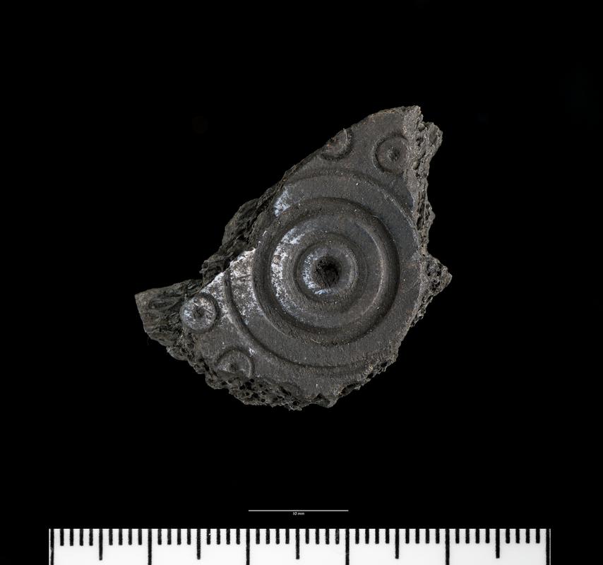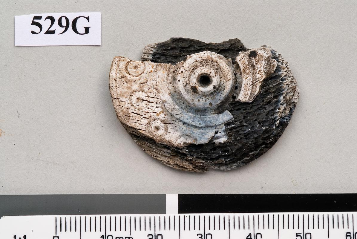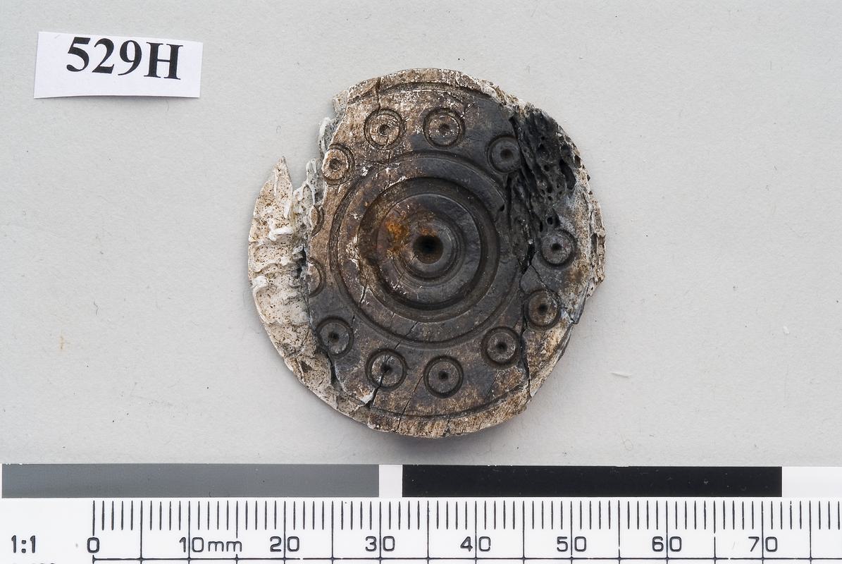 (Type 4) Tableman or counter/gaming piece cut from antler or cattle mandibles. Lathe-turned flat discs used in tabula or tables (board games). Decoration appears on one side and are usually five concentric incised lines or grooves (3 inner and one outer circle). All have a repeating circle of ring and dot ornament. Type 4 The concentric circles are well defined, comprising one thin outer line, two wide inner grooves and central hole.