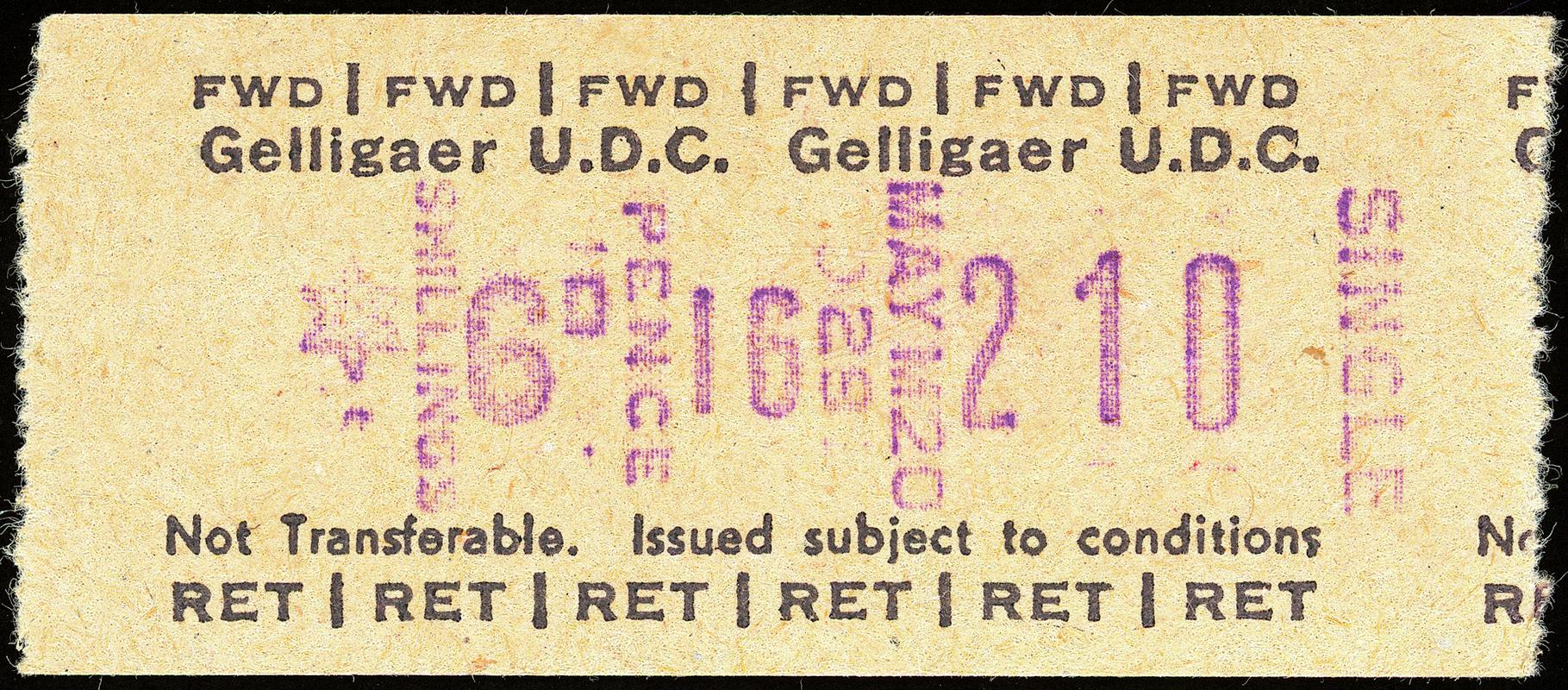 Black and blue print on cream paper. Gelligaer U.D.C. bus ticket (Setright type).