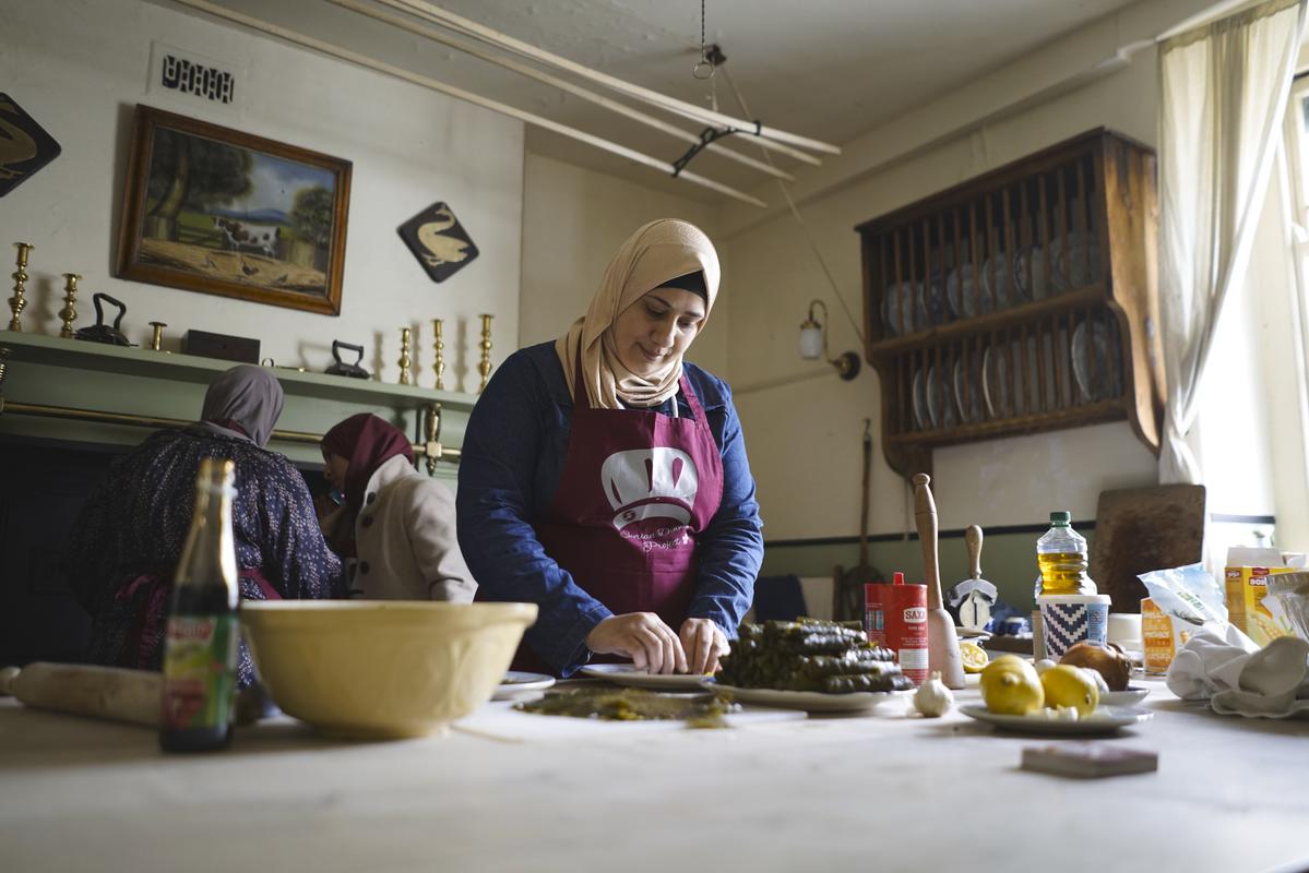 Digital photograph of the Syrian Dinner Project team demonstrating recipes at Llwyn-yr-eos farmhouse, St Fagans National Museum of History.