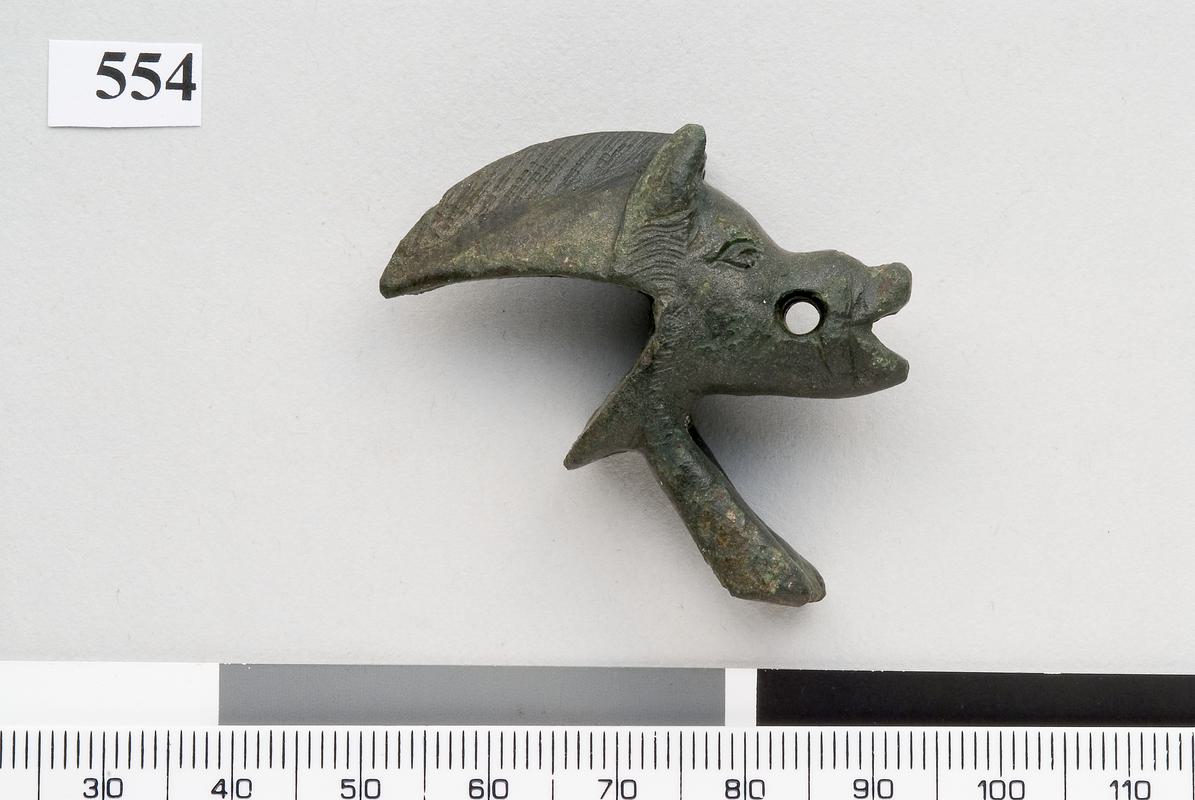 Possible iron escutcheon consisting of a circular plate with a central perforation expanding to form a simple loop. An opposing loop or decorative piece has broken off but the steep curve suggests it may have supported a large bowl. A similar object, identified as a drop-hinge was recovered from a late 4th century AD context at Segontium (Casey, Davies and Evans 1993, p 195-7, fig. 10.7).