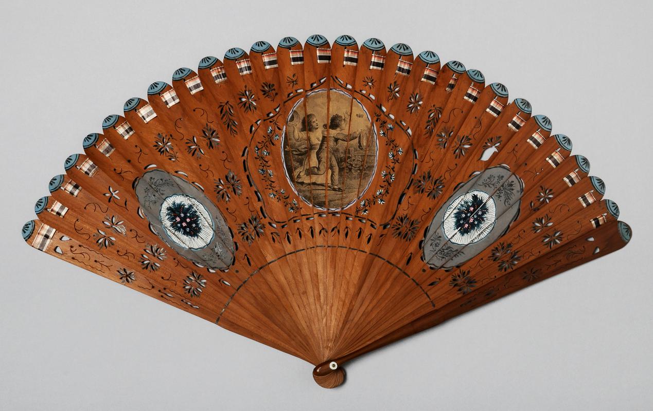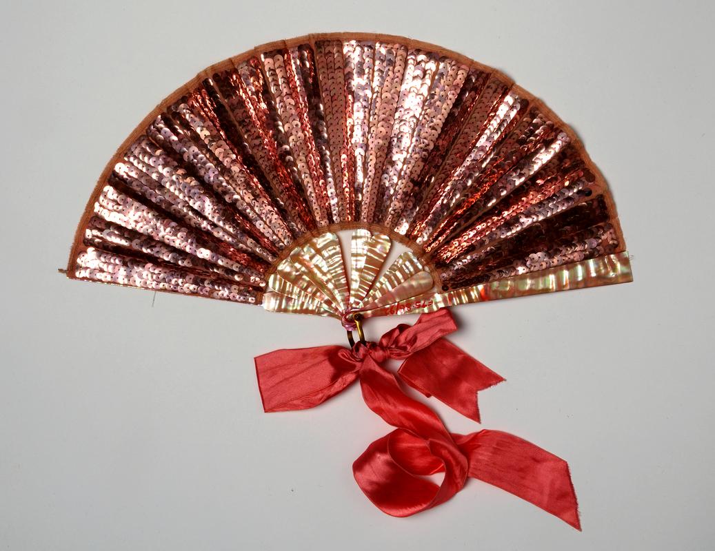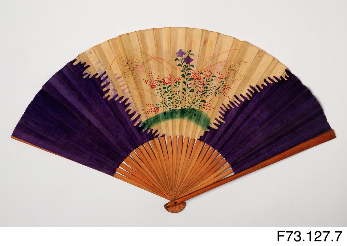 green celluloid fan; painted with bunches of blue, purple & pink flowers with gold dot for centres on each stick. Sticks are threaded with a pale green silk ribbon