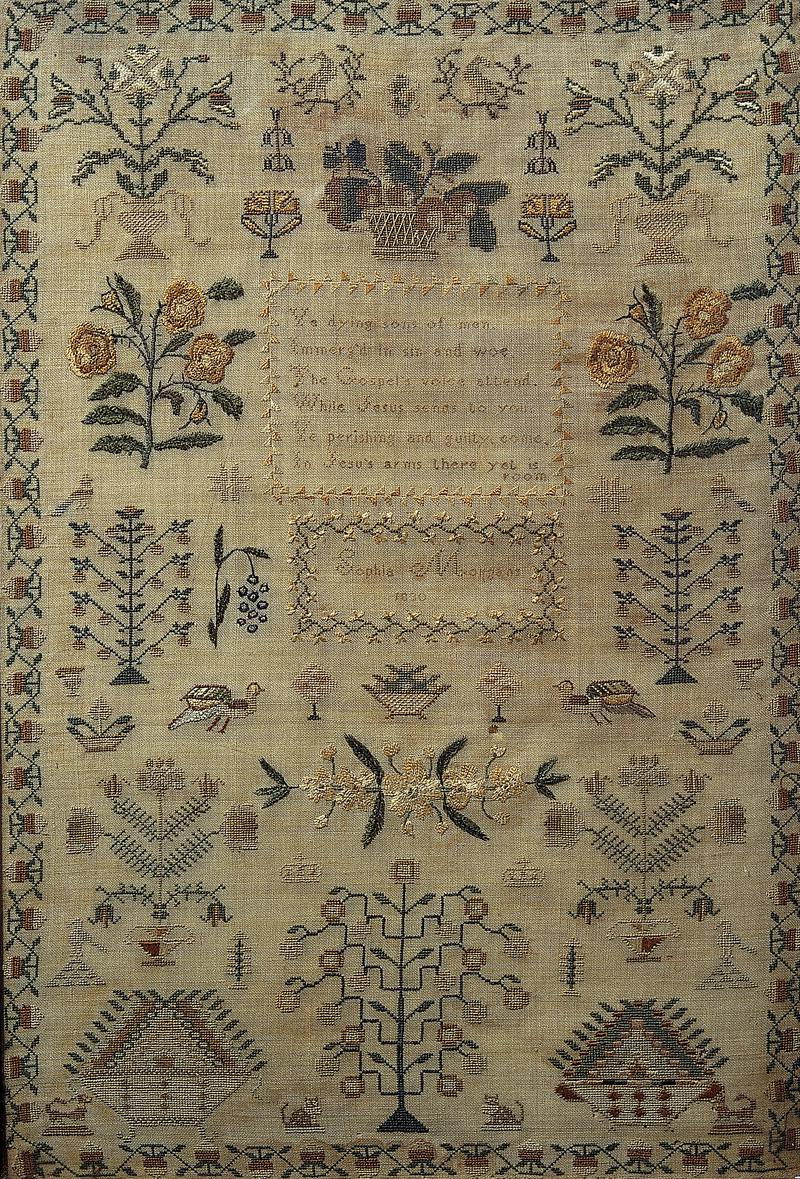 Cotton ground fabric embroidered with coloured silks in cross stitch. The whole of central part consists of long mourning verse entitled 'The Reaper and the Flowers'. Verse flanked by large elaborate woolwork floral motifs with row of lilies[?] below. One of a series made at Llanfyllin, Powys, in memory of members of the Davies family.