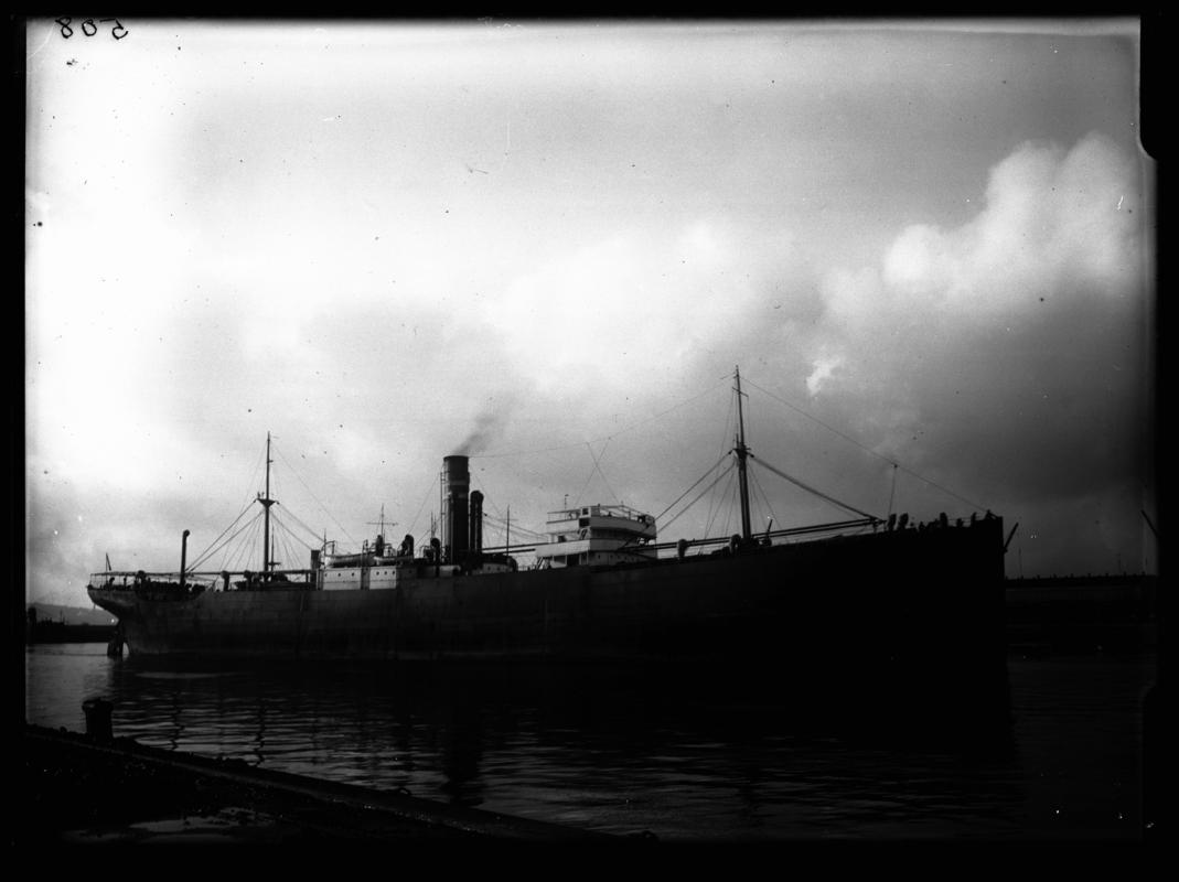 ¾ Port bow view of destroyer S.S. AMSTERDAM at Cardiff Docks. Tug LOWGARTH also in image.