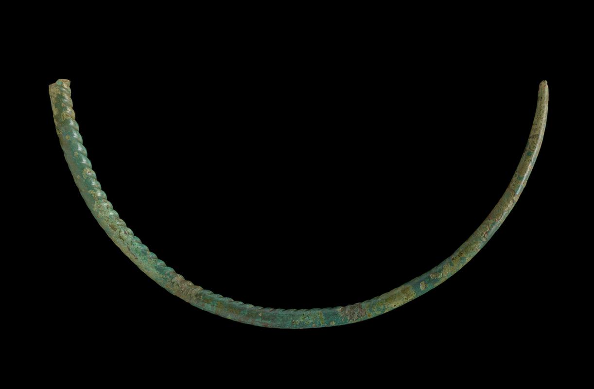 TECHNICAL DESCRIPTION Small mid-section fragment of a twisted bronze torc. The twists are tightly spaced with a Z-shaped curve, each ridge approximately 1.7mm wide and with the top of each ridge approximately 3.0mm from the next. The twists are visible on both the interior and exterior surfaces of the torc, suggesting moderate use-wear before burial. The breaks are soil covered, one end break being defined and the other looking more worn. One upper or lower surface has been recently damaged with a linear scar, revealing bronze metal. Original surfaces have a green-grey patination, while damaged surfaces and breaks have a lighter grey-green patination.