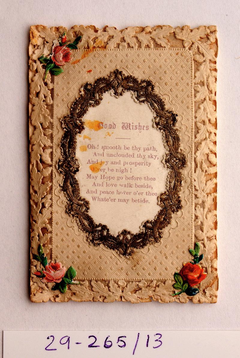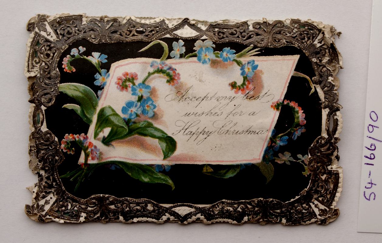 Light pink silk handkerchief with lace border. Rose wreath embroidered in one corner. Inscribed 'Happy Christmas'.