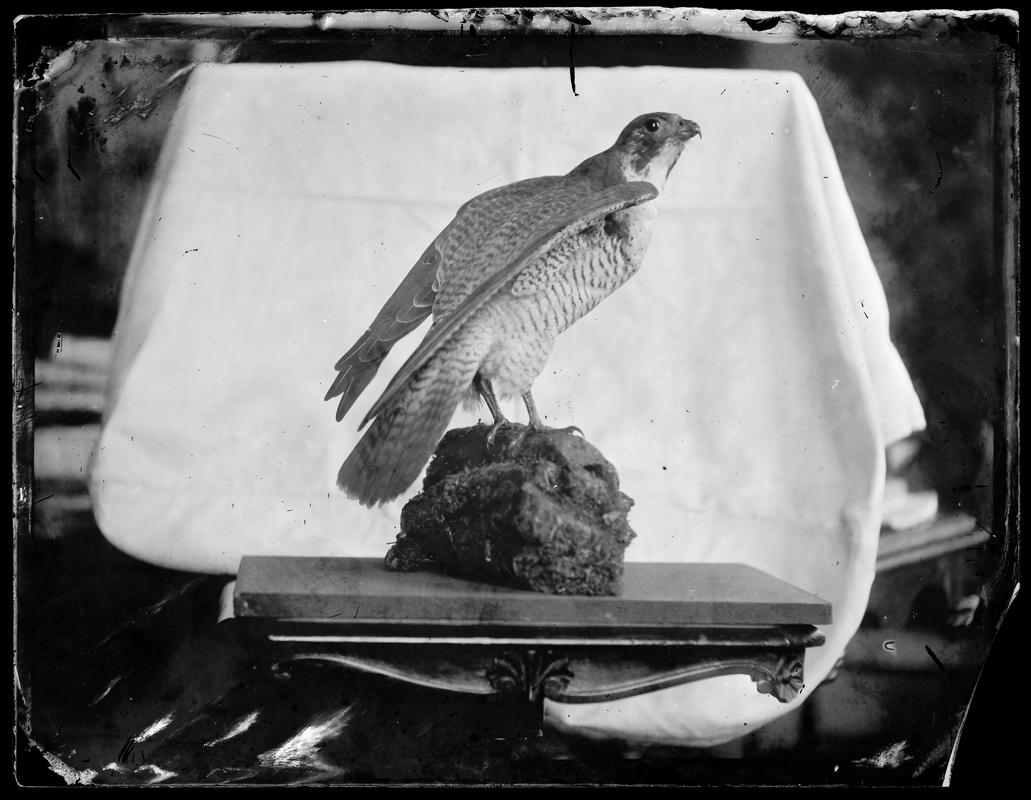 Collodion glass negative showing a mounted hawk perched on a rock ona table.