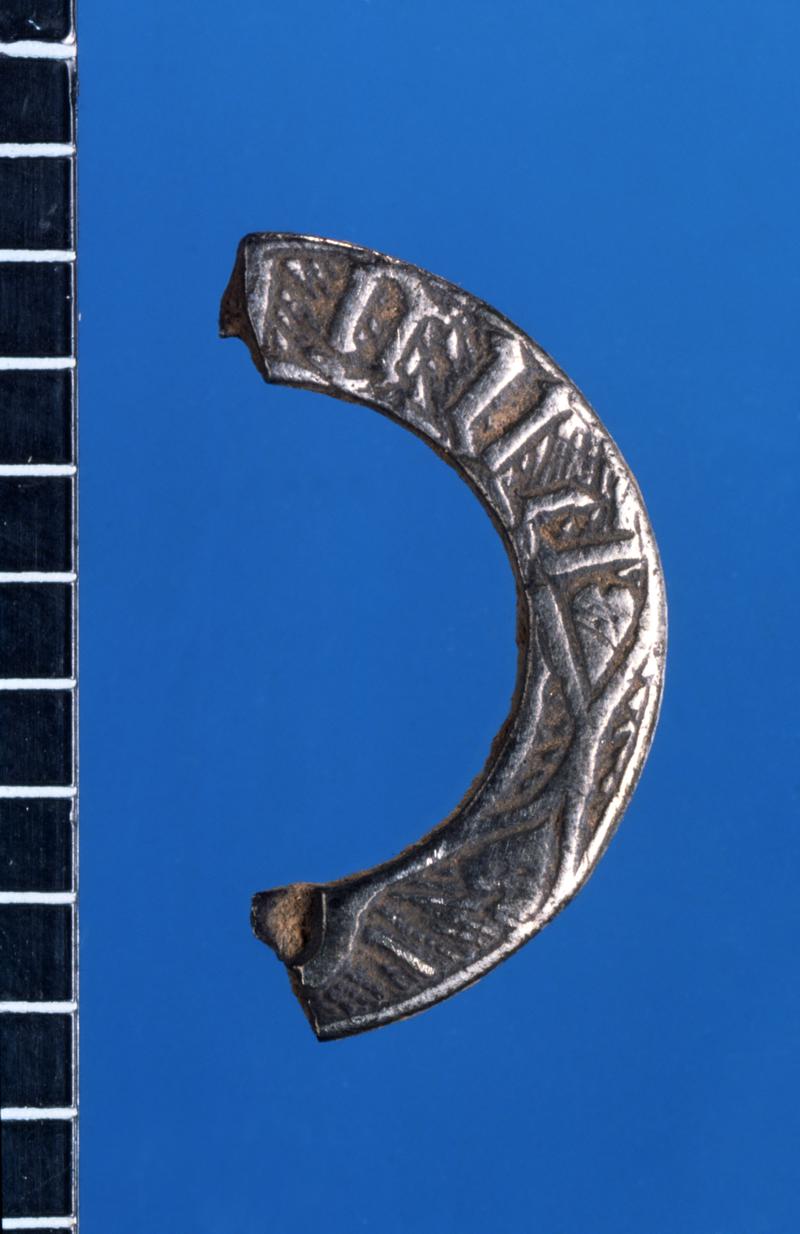 Small, silver annular brooch with circular frame. Frame is cicular in cross-section, nd one sie (front) is decorated with two clusters of transverse grooves filled with niello. The wrap-around head of the pin that secures it to the annular frame of the broochis slightly wider than the shaft.