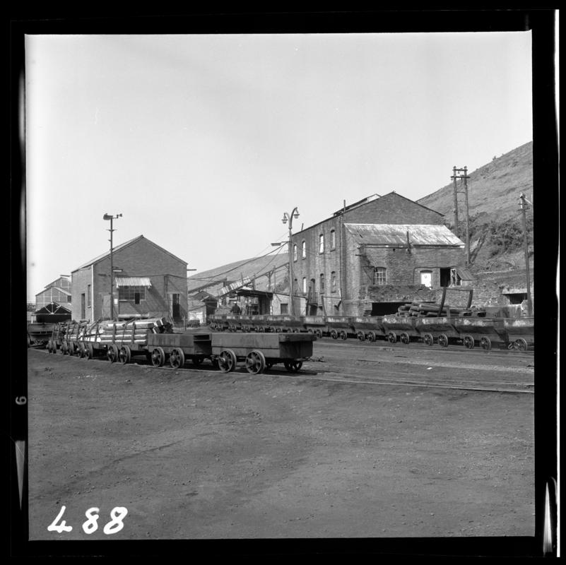 Black and white film negative of a photograph showing Snowball, a show pony at Lewis Merthyr Colliery, with a Peckett locomotive, 1909. 'Lewis Merthyr Colliery' is transcribed from original negative bag.