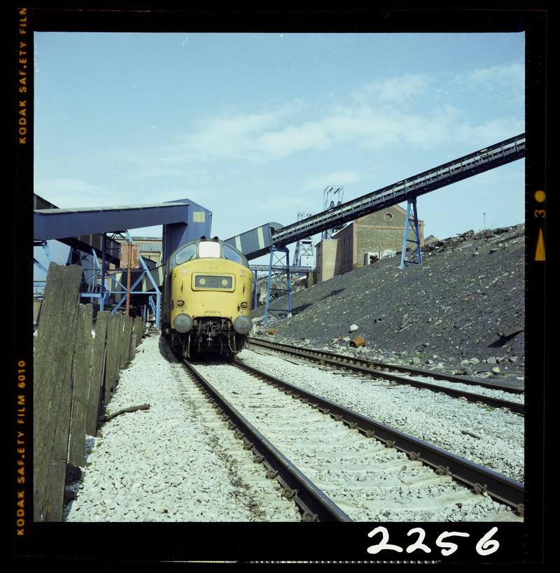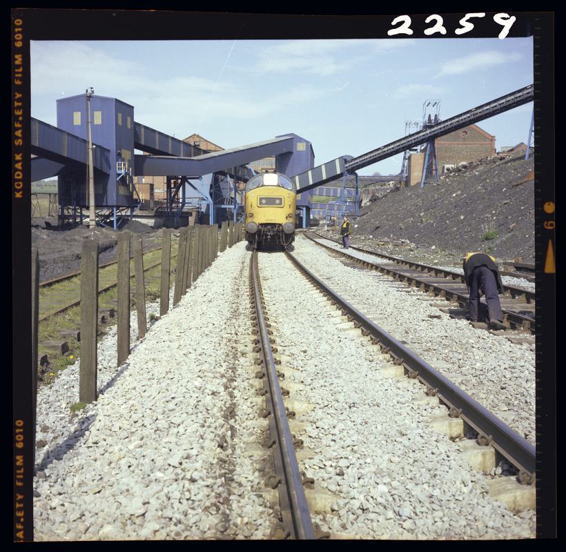 Black and white film negative of a photograph showing Snowball, a show pony at Lewis Merthyr Colliery, with a Peckett locomotive, 1909. 'Lewis Merthyr Colliery' is transcribed from original negative bag.