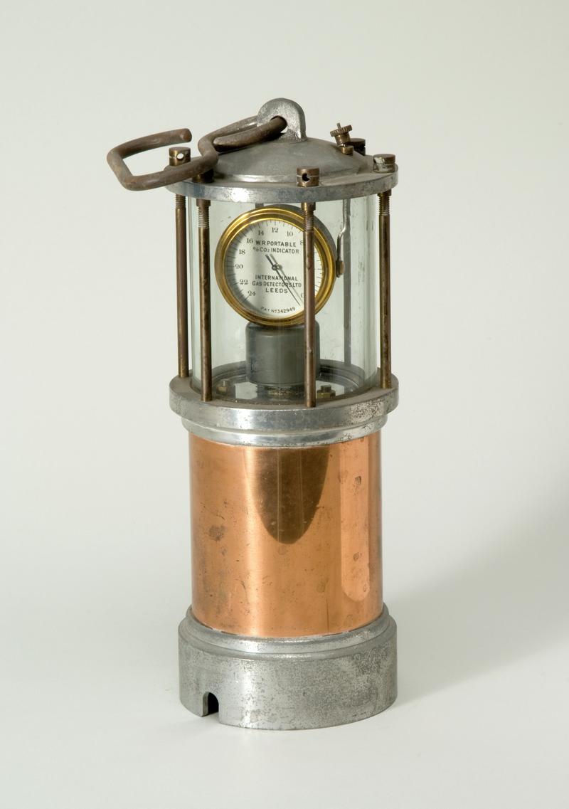 C02 gas detector. White metal and brass construction with brass fittings and clear glass. Carrying handle at top.