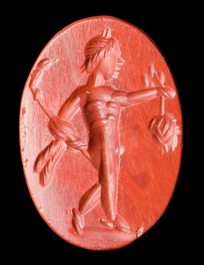 Complete and unchipped, but with considerable wear to the edges of the engraved face. Depicts a dancing satyr, naked except for a fillet on his head. His left arm is raised before him, whilst his right holds a crook and a goatskin.