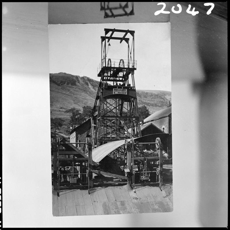 Black and white film negative of a photograph showing a surface view of Ferndale no.2 and no.4 pits. 'Ferndale 2-4' is transcribed from original negative bag.