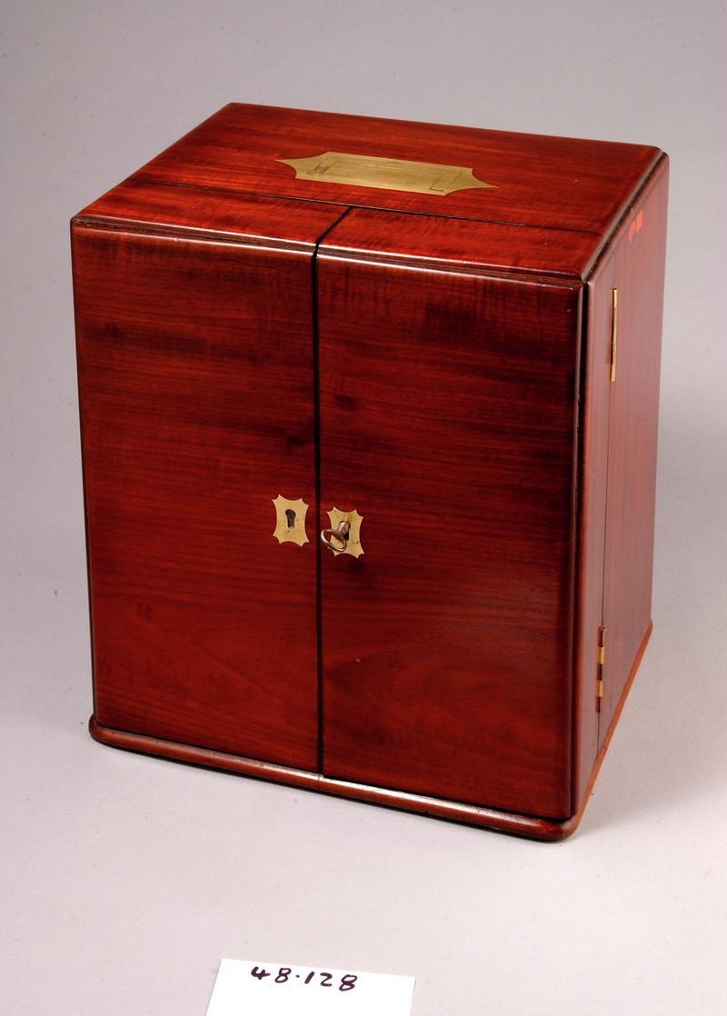 watch-;like carriage clock with inverted winder placed in a rectangular folding carrying case; Arabic numerals, luminous with 24 hour clock figures in outer ring; Swiss lever movement