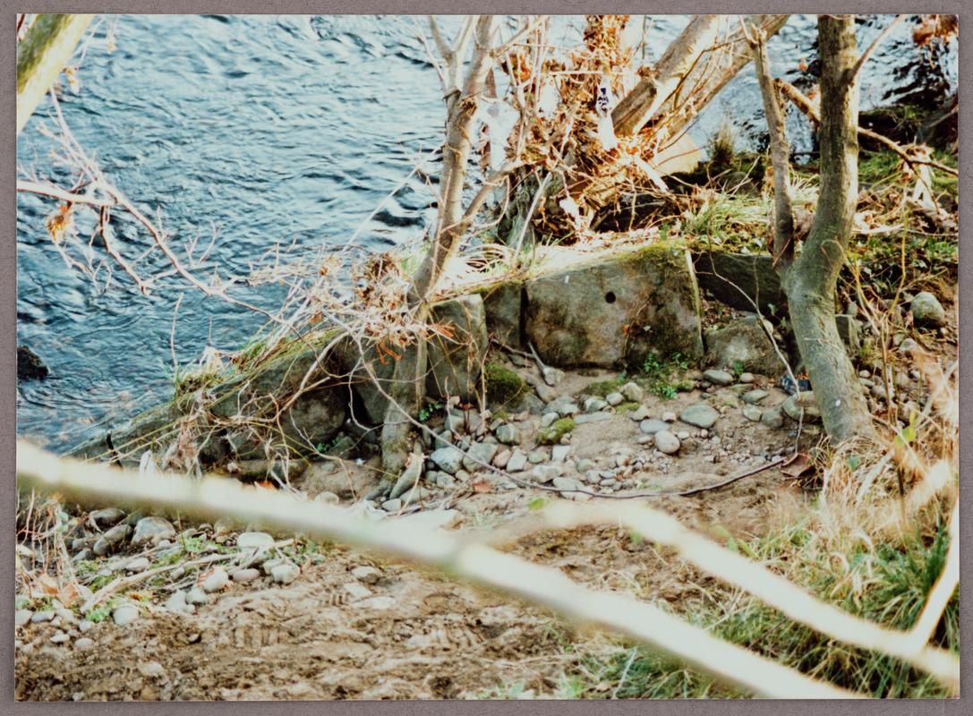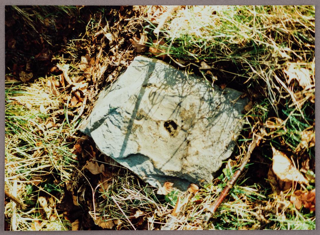 Embankment of the Graigola Tramroad at Clydach on the Swansea Canal. Inscription on reverse. The tramplate and tramwheel recovered from this location were accessioned as 2003.99 (possibly) and / or 2012.9 (probably).