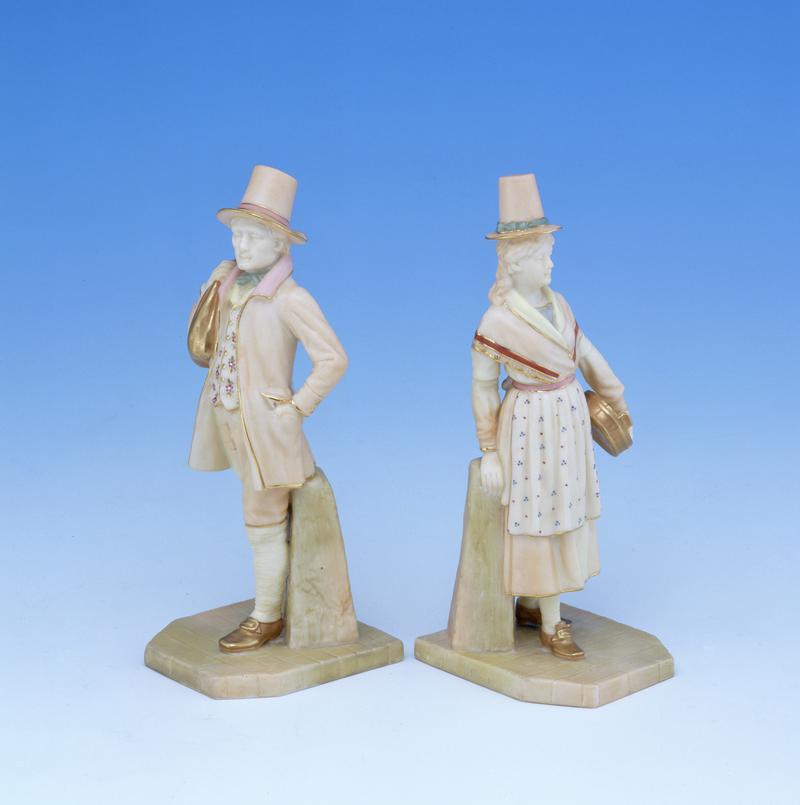 Figure of a Welsh man, stained ivory porcelain, standing on a flat base moulded to resemble floor tiles or bricks, the figure supported behind by a short rectangular rock, the figure wears a stove-pipe hat, green neck-tie, flowered waistcoat, pink-lined coat, knee-breeches, stockings and gilt shoes, over his left shoulder he carries a gilt sack, the figure is coloured using glazes of delicate soft shades, with the base coloured a yellowy-pink shade and much of the costume coloured a pinky-orange shade with gilt edging.