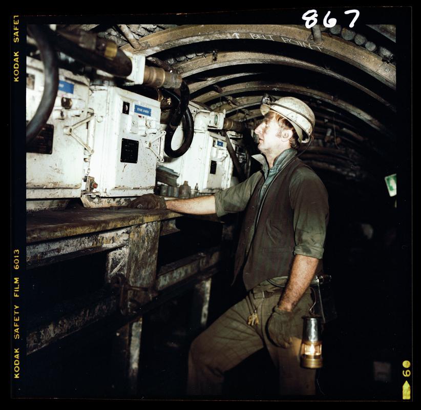 Colour film negative showing a man operating a haulage engine at Wyndham Colliery.