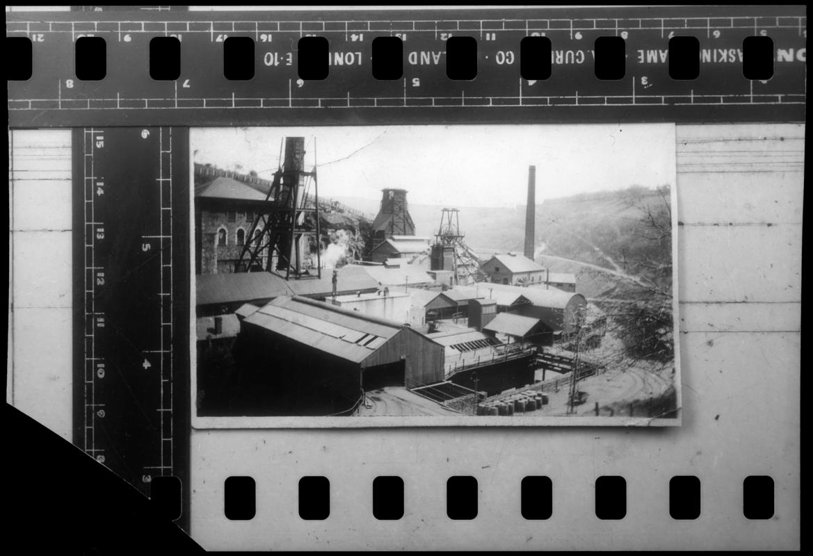 Black and white film negative of a photograph showing a general surface view of Whitworth Colliery, Tredegar. 'Whitworth' is transcribed from original negative bag.