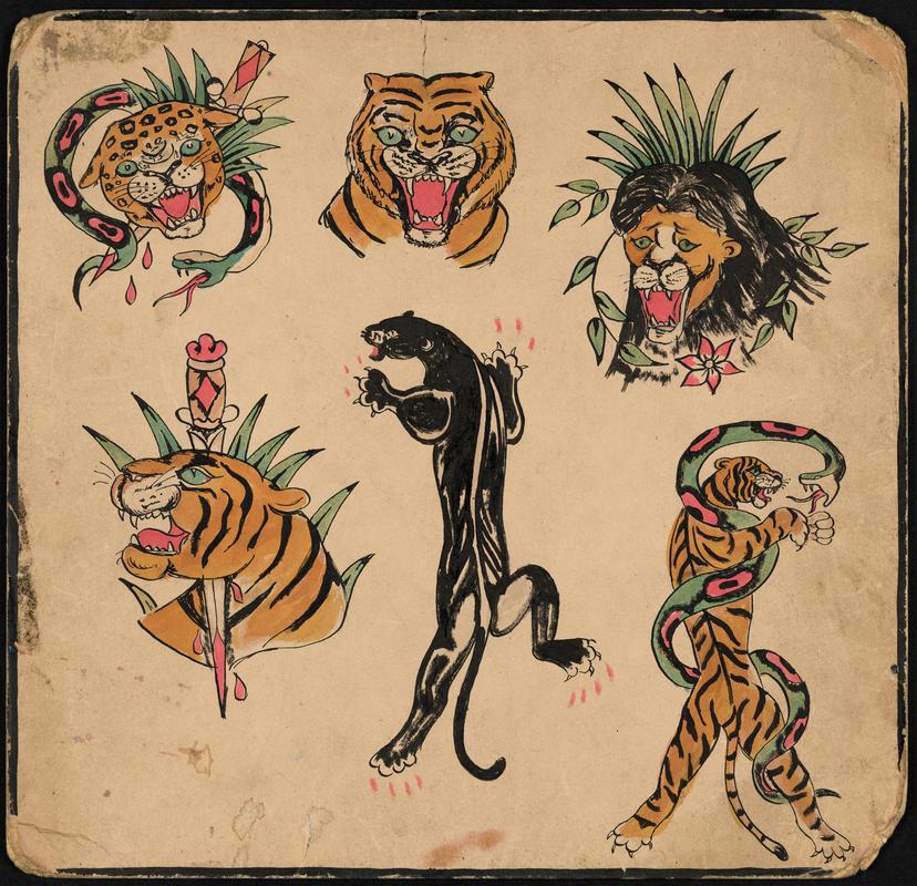 Tattoo flash on card, two images of roses and one image of hearts / banners. Two large images of roses on reverse. Stained on front and ragged in places