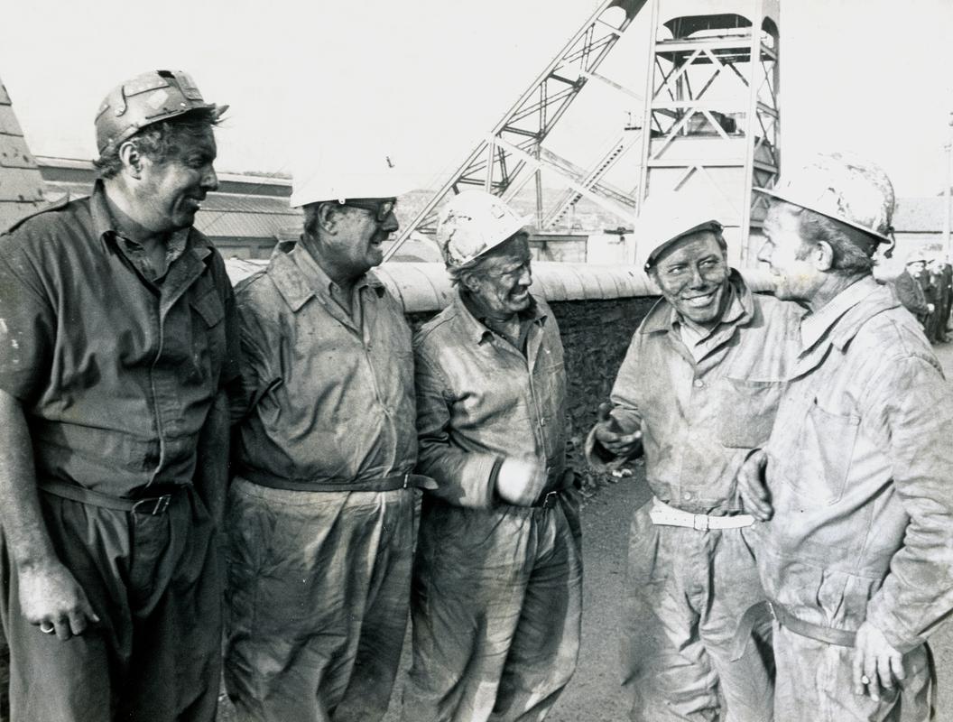 Black & yellow print on both sides of thick paper. One side shows the head of a miner, and the other has a photograph of Penallta Colliery with statistics printed below.