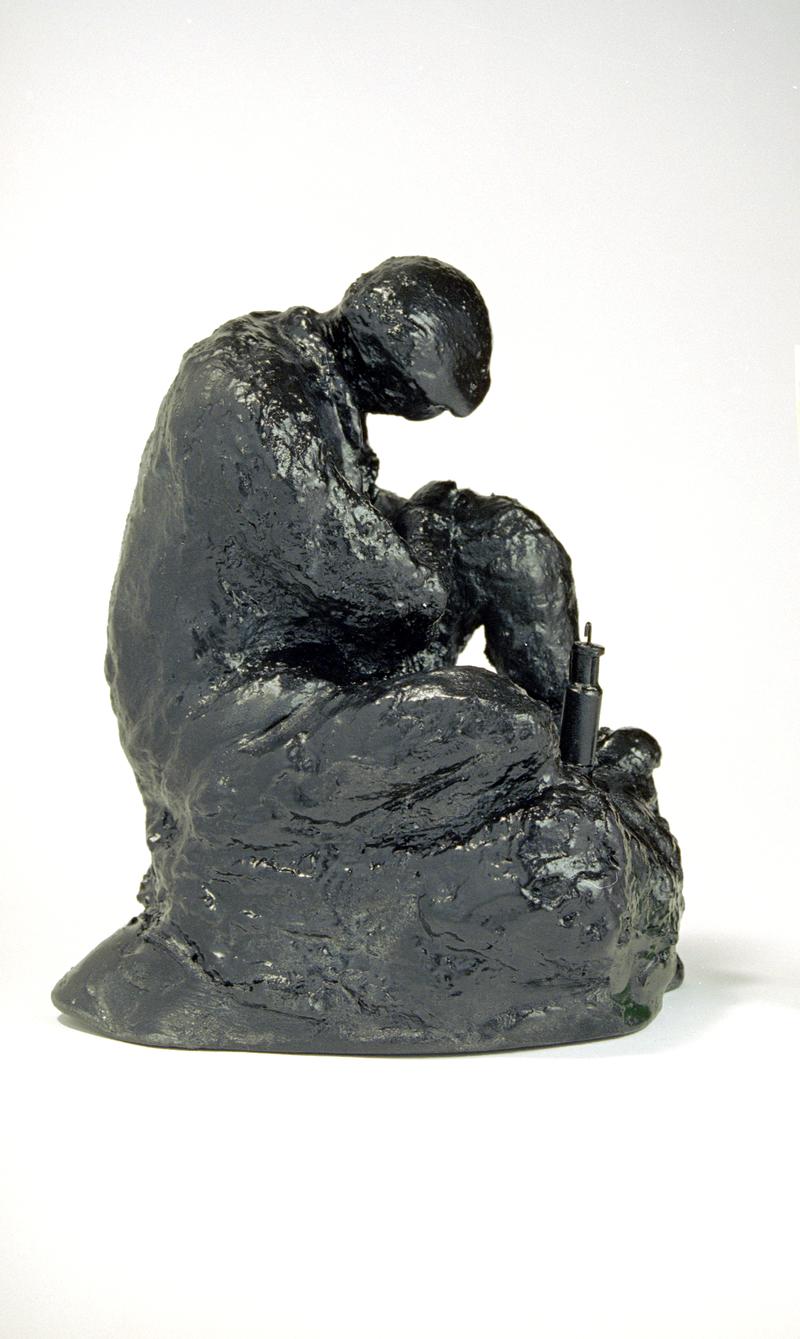 Sculpture 'Collier and Chapel Deacon / Glôwr a Diacon Capel' by George Brinley Evans. Plaster on nylon and wire frame, painted black. On a wooden base with brass plaque.