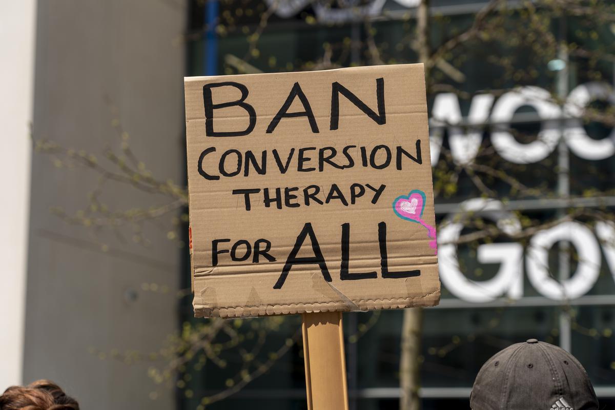 Digital photograph taken at the protest, organised by Trans Aid Cymru, against conversion therapy, on 26 April 2022. About 150 people protested outside the government offices on Wood Street in central Cardiff to oppose conversion therapy for transgender people in the UK.