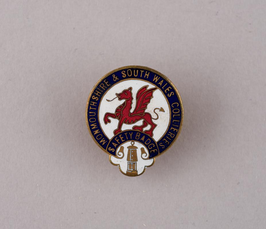 Circular white metal lapel badge with design of headgear over a dragon set in red and black enamel. Pin clasp on reverse.