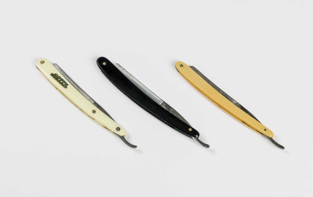 cut throat razor comprising of black plastic casing / handle with moulded Crown & Sword emblem; stainless steel blade attached to handle by metal rivet; two other rivets hold plastic casing together; complete with cardboard storage box coated with black embossed papier mache design
