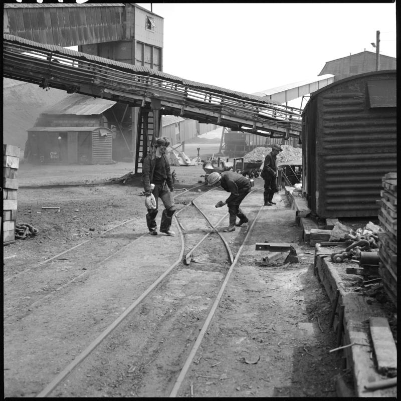 Black and white film negative showing pit bottom at Cwmtillery Colliery 22 November 1977. 'Cwmtillery, 22 November 1977' is transcribed from original negative bag.