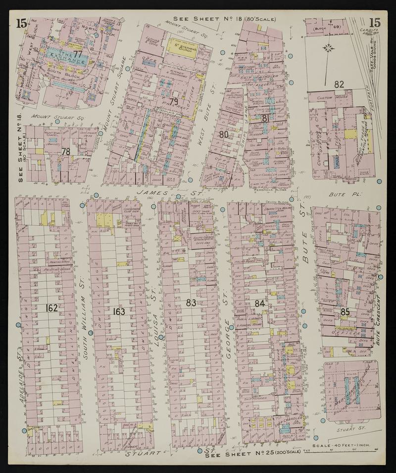 Fire Insurance Plan, drawn in Cardiff in 1909, showing in detail streets, buildings and companies operating within Cardiff Docks area. Sheet No. 19 Showing Spillers Bakers Ltd., Tubal Cain, Robinson David & Co. Ltd, Hills Dry Docks & Engineering Co. Ltd, Tyndall Street. Scale : 80'0 to 1" and 40'0 to 1" Black line with blue, yellow and pink detail. (Clear plastic cover with blue card background)