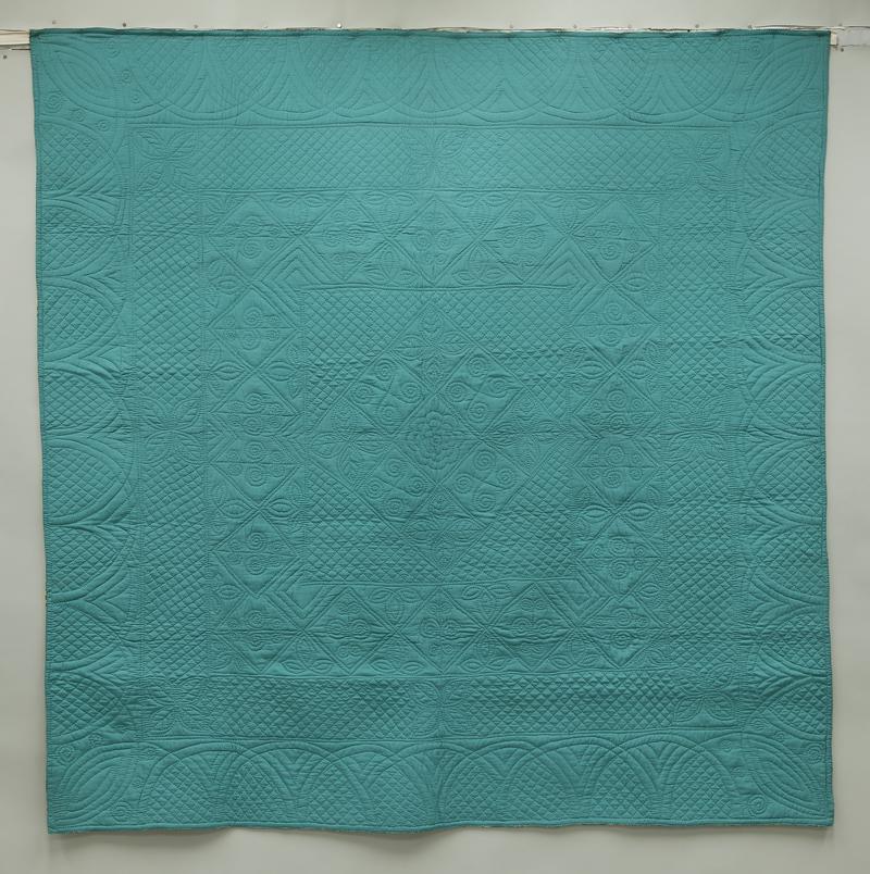 Wholecloth quilt made by Miss Elizabeth Davies of Brynwalis, Pencader. Made for Elizabeth Williams, Maescanol Farm, Llanybydder, on her wedding to John Evans, Tan-y-Fron Farm, Llanwenog.