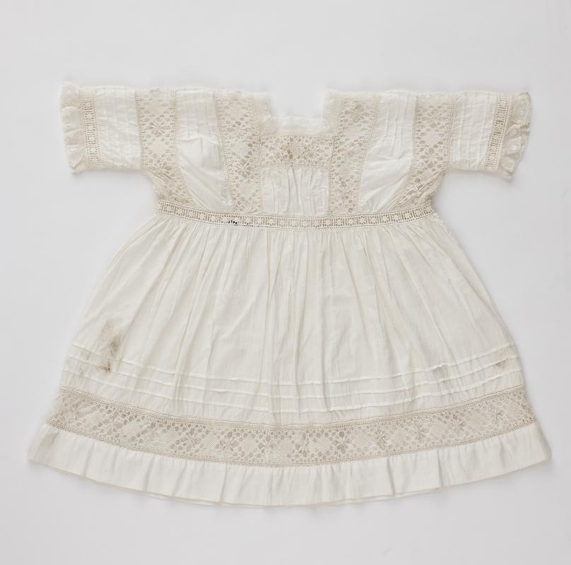 Baby's ribbed cotton jacket with long sleeves, fold-down collar and a single mother of pearl button fastener. The collar, cuffs, front and hemline are trimmed with a machine-made broderie anglaise border. Made by Belgian refugee nuns in Newport, Gwent, during the First World War.