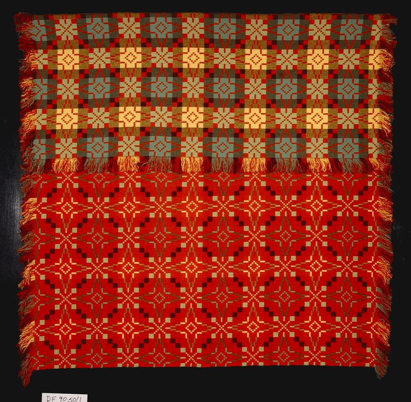 Black and white square design on yellow and green base. Awarded first prize at Royal Welsh Agricultural Show 1965.