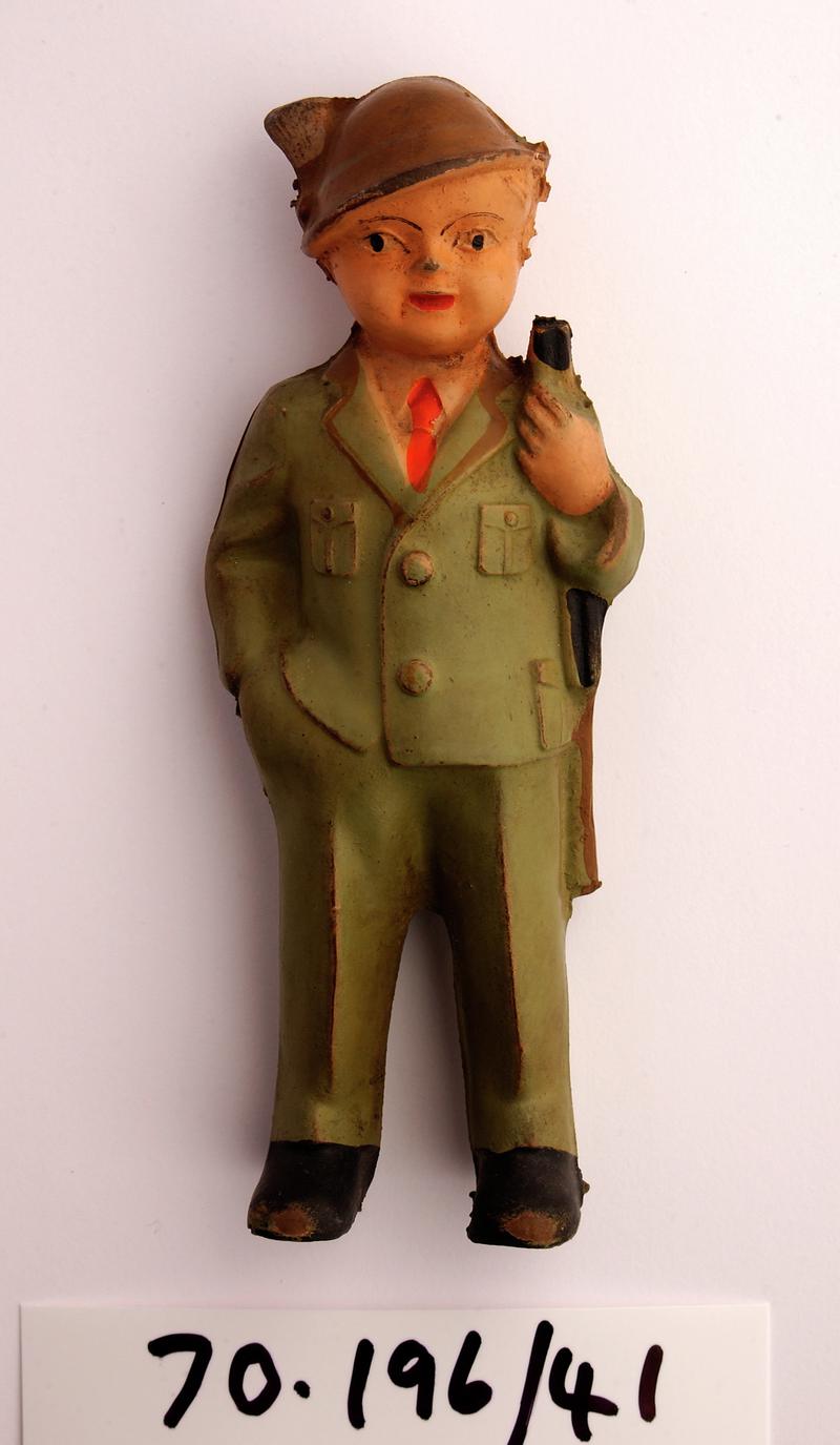 Ventriloquist’s doll made from a composition shoulder and head. The pate is painted brown with painted comical features. The torso is stuffed, and the forearms are made from papier-mâché. The jaws are manipulated by string through the rear of the torso. The doll wears black trousers.