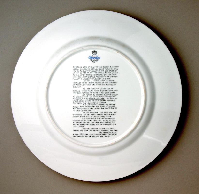 Circular plate. Design at centre shows a flame safety lamp with inscription around. View of twelve different collieries painted around edge with inscription below each. Detailed inscription painted on reverse.