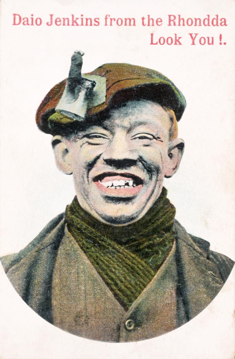 Colour cartoon drawing of coalminer, "Daio Jinkins from the Rhondda Valley, Look You!". Handwritten message on reverse. Postmarked Pontypridd Nov. 6th 1909.