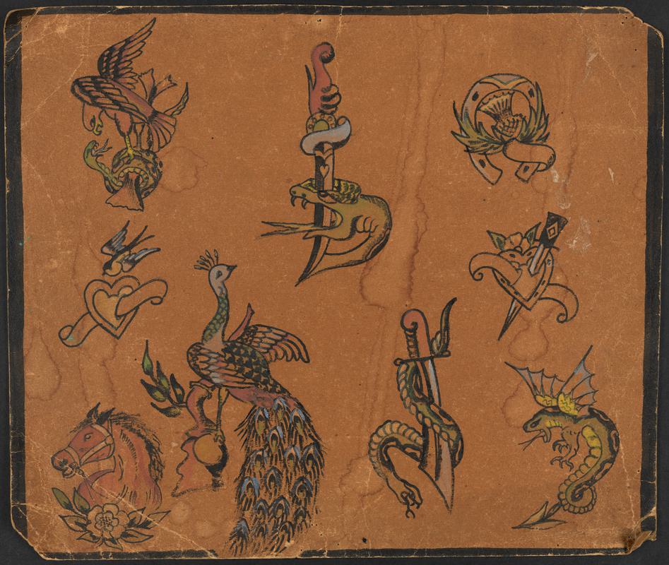 Tattoo flash on card. Six images of eagles with snakes and a skull. ‘23’ in top left corner. Six images of eagles with US flag and text ‘U.S.N’ on reverse. ‘125’ in top left corner.