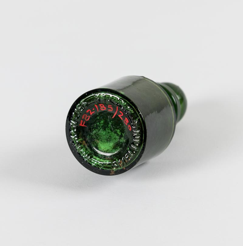 Dark green bottle, with crown-shaped stopper; probably for smelling salts.
