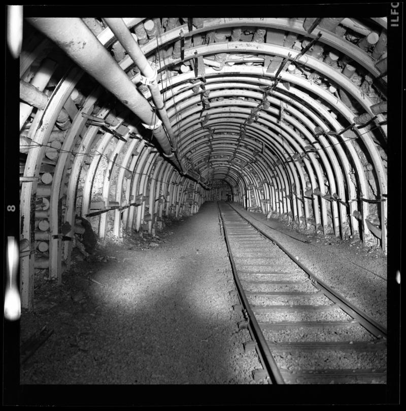 Black and white film negative showing pit bottom, Cwmtillery Colliery, 22 November 1977.