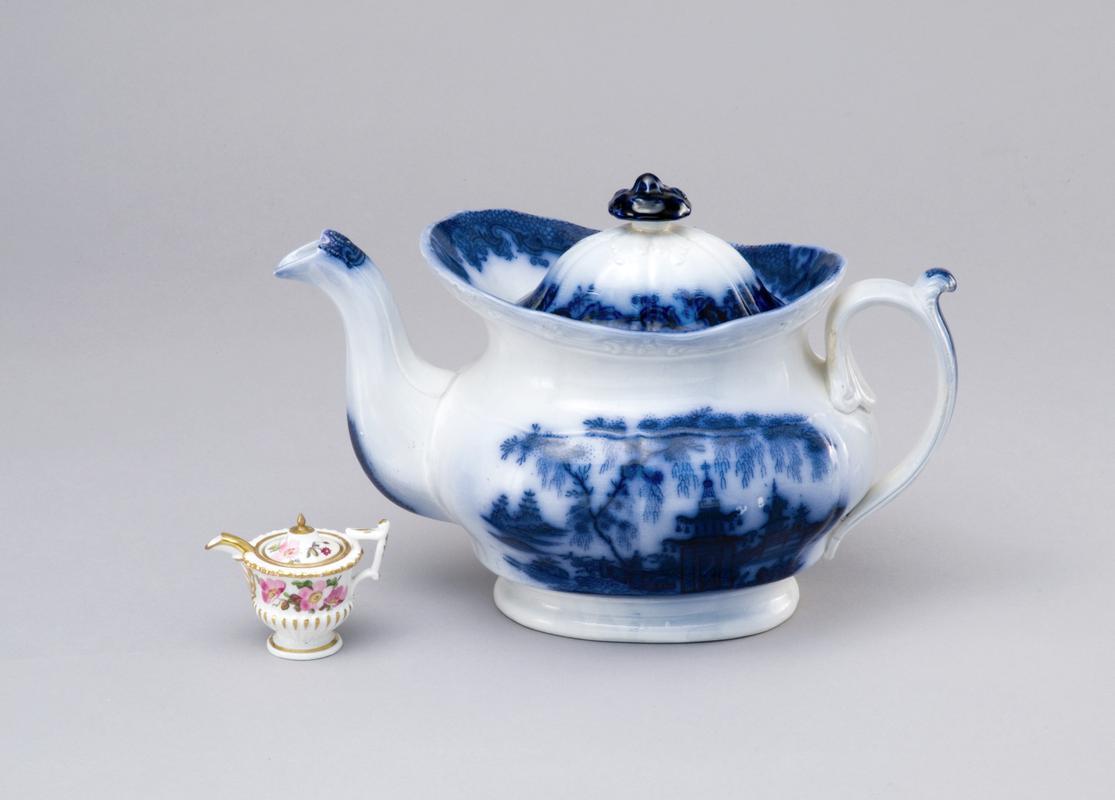 Teapot ( cover missing ), soft-paste 'duck egg' porcelain; rectangular shaped foot rim, bulging sides to shoulder, concave curve to waved lip; loop handle with a thumb spur and a pointed terminal; curved spout with moulding above lip; painted with set pattern 419; a gilt border pattern below the shoulder of arcades with pendant alternating anthemions and red lozenges with a green dot in the centre; a gilt continuous leaf pattern above the shoulder; plain gilt bands to foot rim, lip, handle, and a gilt rosette and anthemion on the spout.