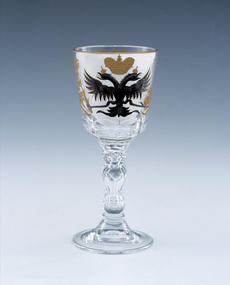 Drinking glass, standing on a high conical foot which is a later substitute for the original foot, waisted baluster stem cut into diamond and oval facets, bucket bowl cut with oval facets around the base, the bowl wheel-engraved with to one side the Russian Imperial Double Eagle surrounded by foliage and to the other side the Imperial Monogram of Tzar Nicolas II enclosed by a cartouche of banners and a crown, the wheel-engraving in-filled with black enamel and gilt.