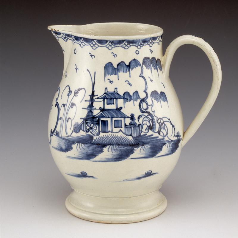 Jug, earthenware, bulbous body, short cylindrical neck, beak spout, loop handle with raised thumb-spur; the exterior bodyand inside neck of the jug covered all over with a chocolate brown ground, this then transfer-printed in yellow with around the sides an exotic garden scene with figures, elaborate buildings and carved pillars, around the interior and exterior neck a Greek key-pattern border.