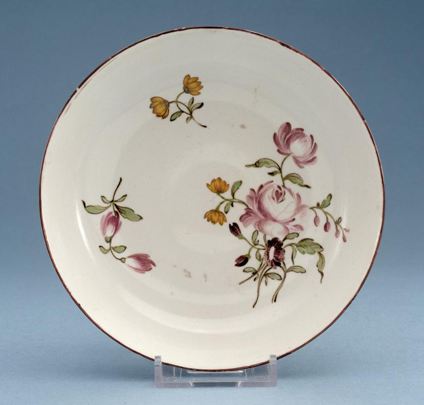 Saucer, hard-paste porcelain, standing on a foot rim, spreading sides; decorated in polychrome enamels, the centre with a spray of flowers, a pink rose in the centre with various other pink and yellow flowers, one yellow flowered sprig and one purple flowered sprig and three leaves, brown border line to lip.