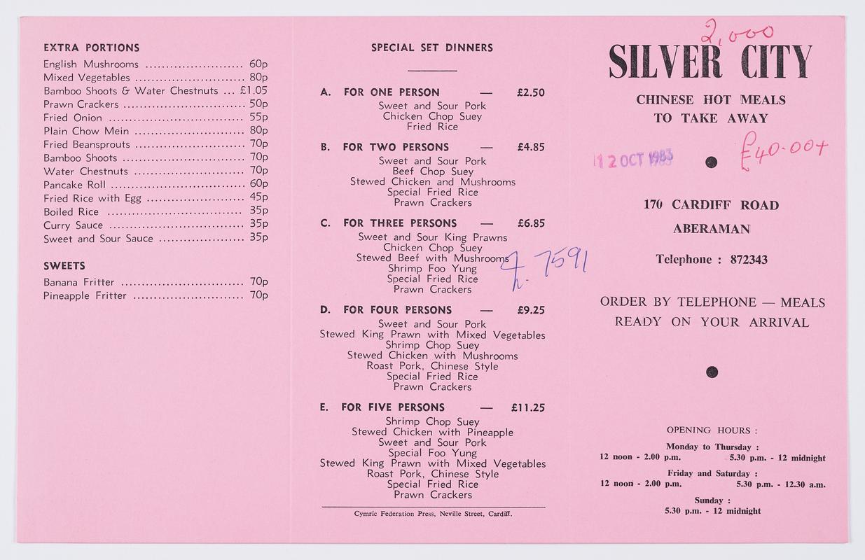 Two 1986 calendars 'Standar Tandoori Takeaway', Canton. Attached to a Cymric Federation Press order form, dated October 1985.