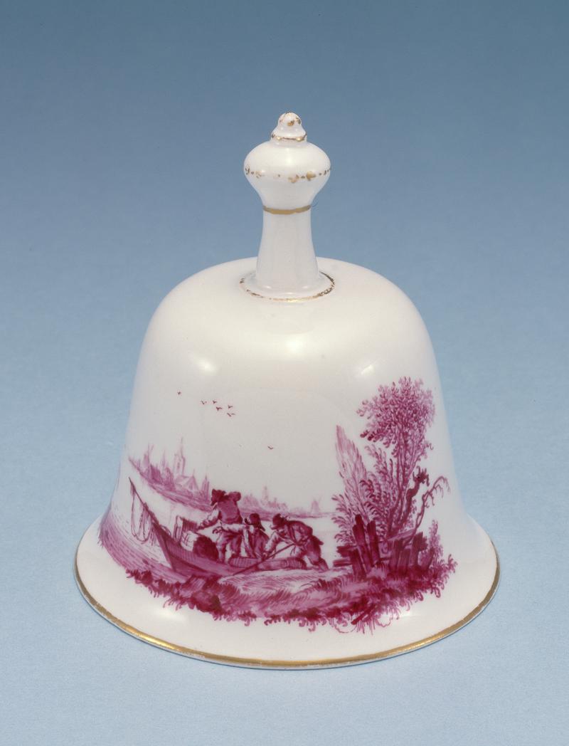 Scent-bottle, standing on a square, flat base, baluster-shaped body, thin neck, everted lip; body modelled with two cartouches and two rams' heads, painted in polychrome enamels, the cartouches each containing a butterfly.