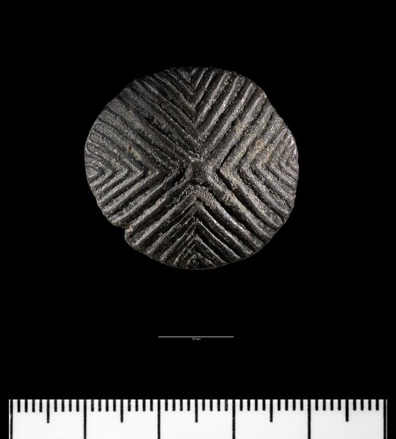 Sub-circular solid disc with an arched attachment loop on a flat bottom surface. The decoration on the disc consists of a series of raised chevron lines radiating out in quarters from a small raised central knop, forming a faint 'cross' pattern.
