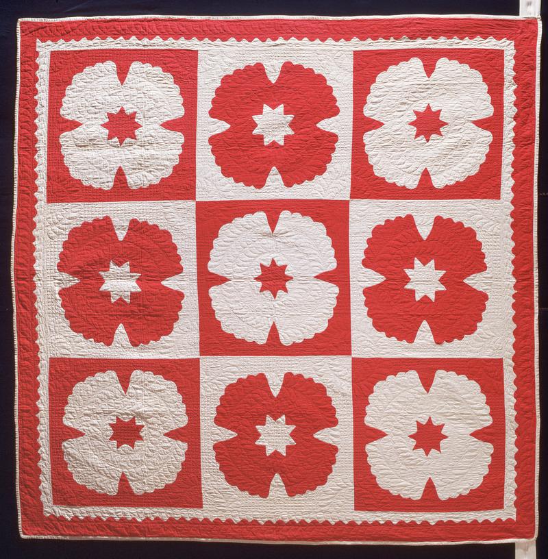Crazy patchwork bedcover of silk and velvet made up in nine squares, with maroon border decorated with ribbon rose buds and embroidery. Wine coloured silk lining. Various embroidered motifs on patches. Made in 1884 by Miss Jennie A. Jones, a Welsh-American from Chicago. The bedcover supposedly won first prize at the Chicago Exhibition of 1884.