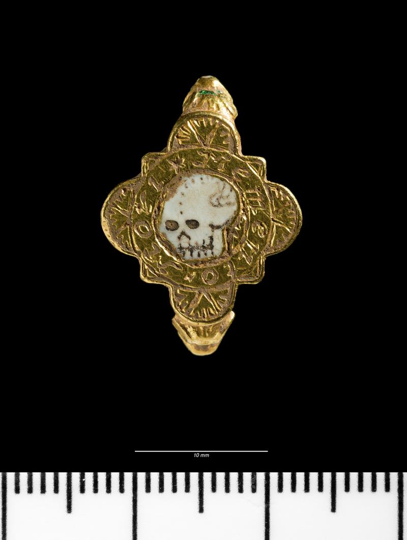 Decorative gold posy-ring. The hoop is of flattened D-shaped section. The outer surface is cast with a repeating pattern of cable pattern cells, originally inlaid with alternating white and blue enamel. Each cell has thre raised gold spots. The inner face of the hoop is inscribed with the text: +LET+LIKING+LAST=, in capitals.