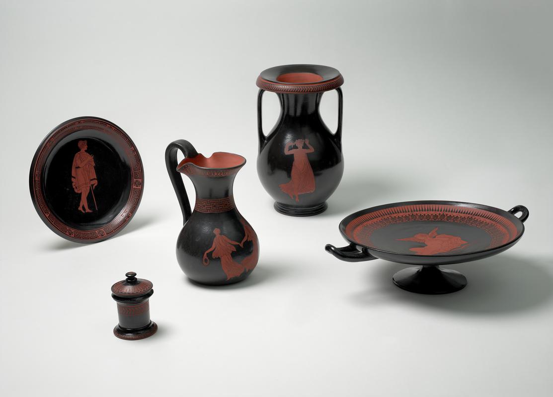 Vase, earthware, Ancient Greek pelike-form, standing on a spreading foot with bulbous body, sloping shoulder and broad turned-over rim, twin plain upright handles; the decoration reserved against a black enamel ground, so that the red earthenware body is revealed, this then transfer-printed in black, to one side of the main body a winged cupid-like figure reclining against a pile of draperies with a bow besides him and to the other side a figure of a semi-naked dancing girl, a running chevron border to the rim.