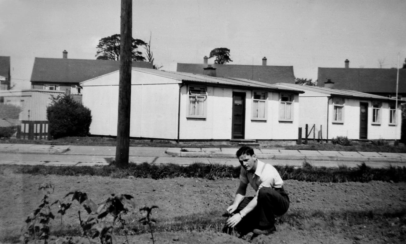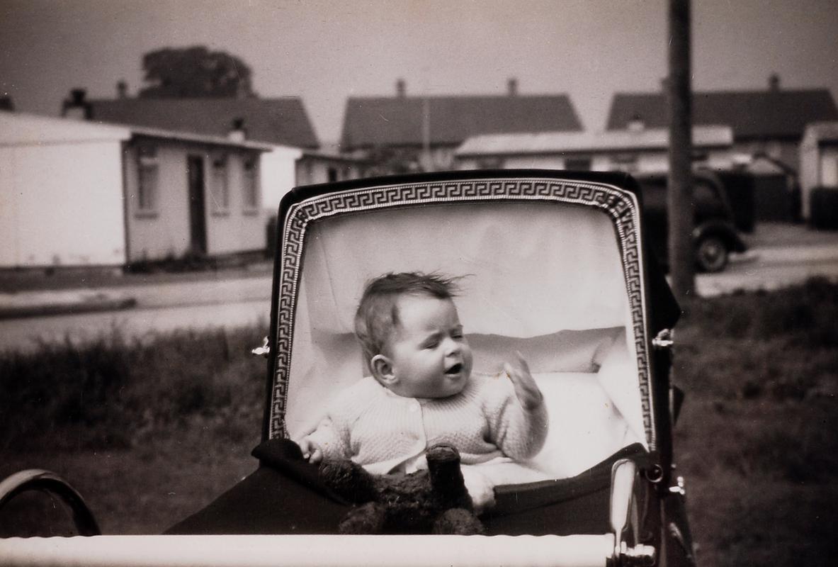 Digital copy of a photograph of Janice Lloyd as a baby sitting in a pram outside the prefabs at Llandinam Crescent, Gabalfa, Cardiff.